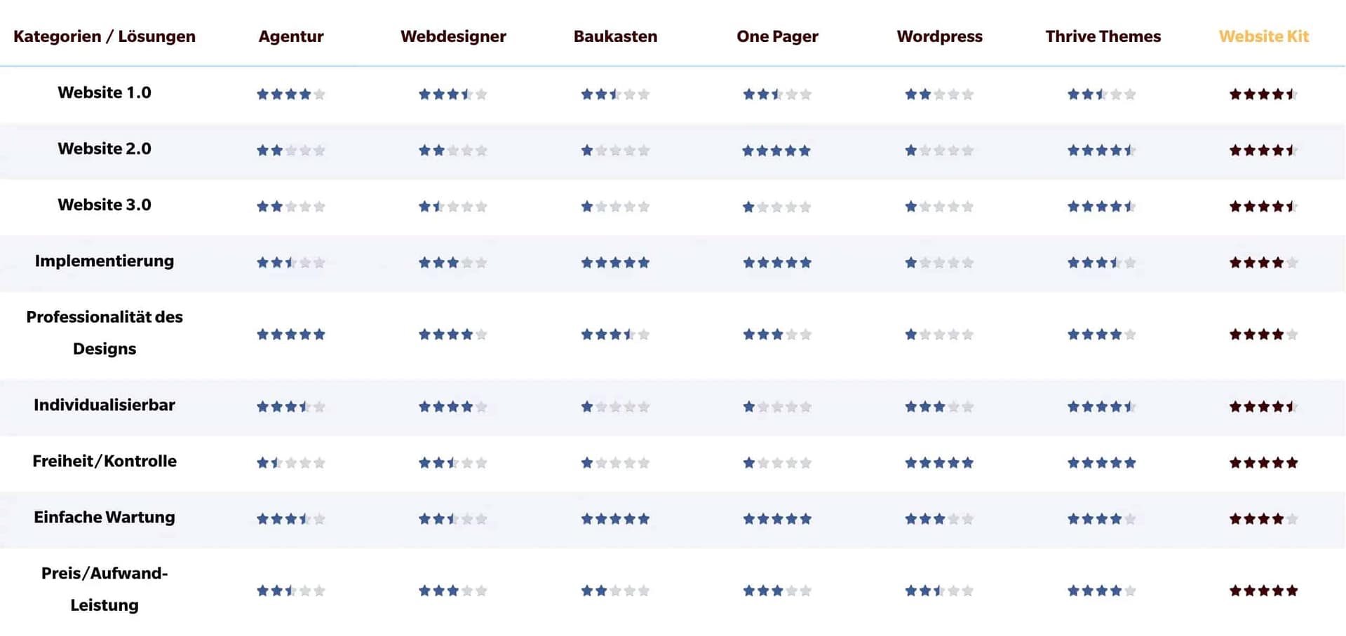 Lass uns nun mal schauen, welche allgemeinen Website-Lösungen es auf dem Markt gibt und welche davon die Herausforderungen an eine professionelle Coaching Website erfüllen. Die folgenden Bewertungen beruhen auf der Annahme, dass du keine 5.000 - 50.000 für eine Website ausgeben kannst oder möchtest und du dir möglichst viel Freiheit und Unabhängigkeit von anderen Dienstleistern wünscht.